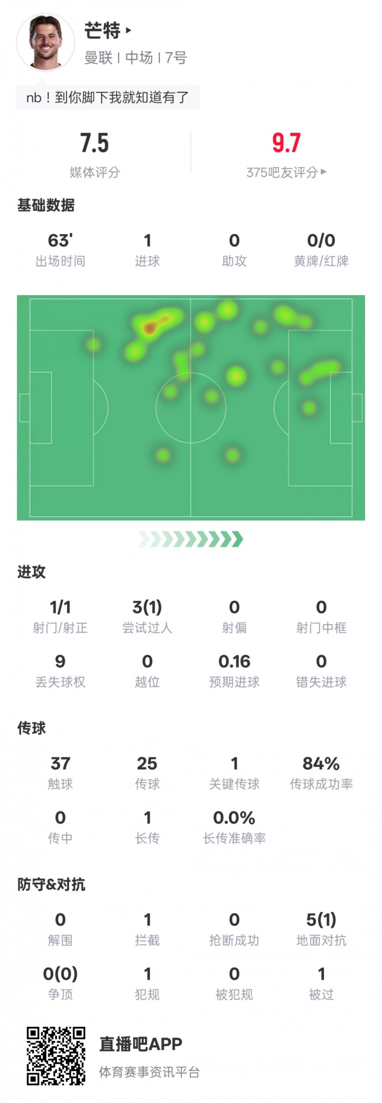 10月4日讯 2025-26赛季英超联赛第7轮,曼联主场迎战桑德兰。芒特首发出战,1次射门1次射正,孝顺1粒进球,1次过东说念主生效,送出1次舛错传球,评分7.5。