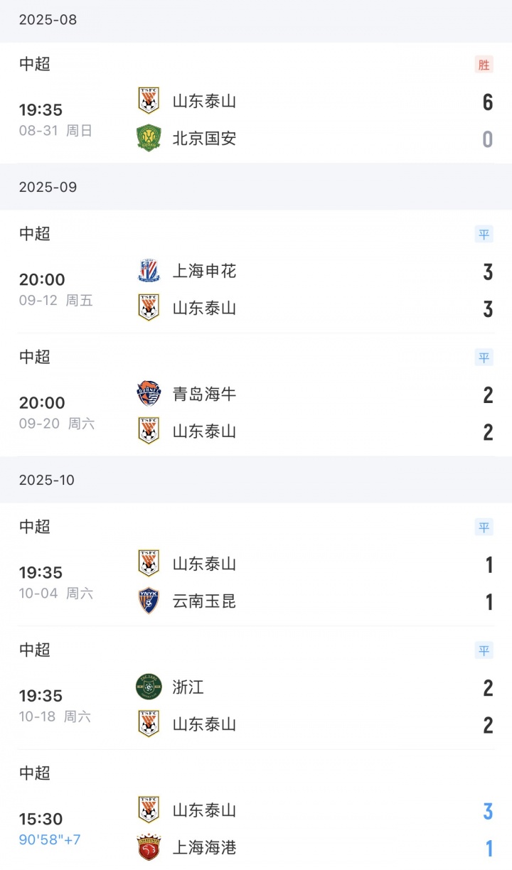 自8月31日6-0大捷国安后,泰山连平申花、海牛、玉昆和浙江。