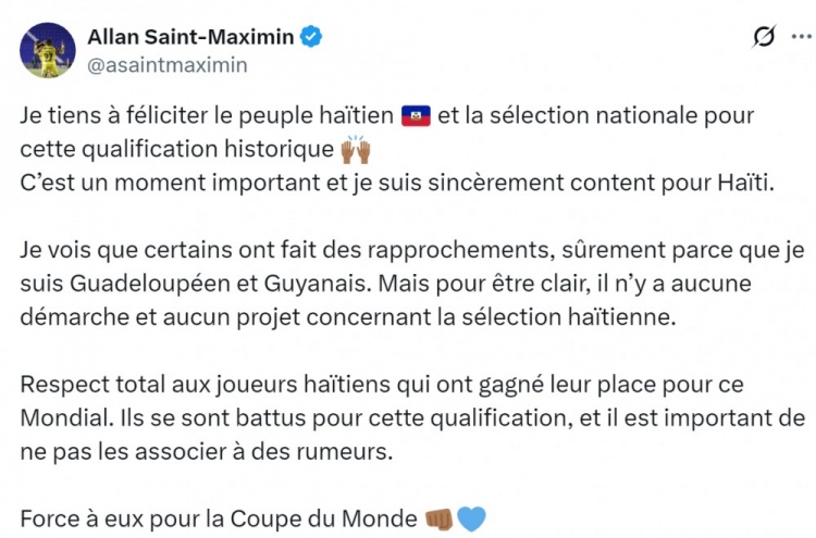 圣马克西曼社媒写说念:“海地历史性地晋级寰球杯,我要对海地大家和国度队暗示祝愿。这是一个伏击时辰,我诚心为海地感到餍足。