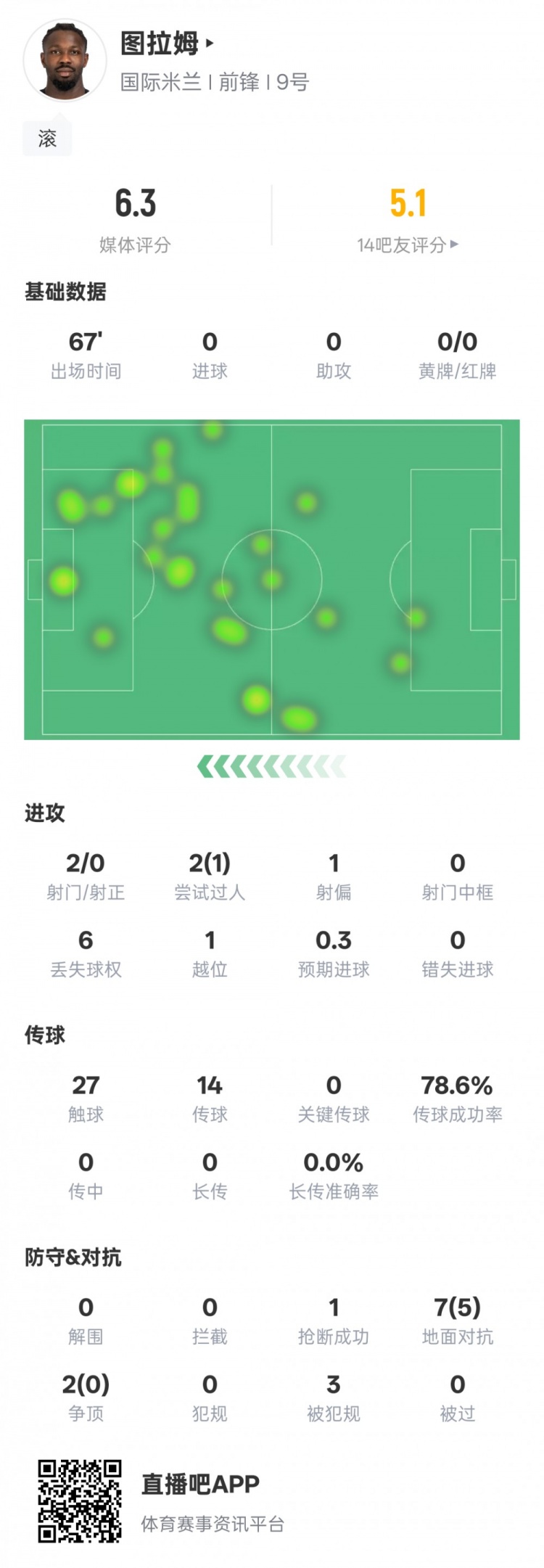 11月30日讯 2025-26赛季意甲第13轮,国米客战比萨,图拉姆先发出战,2射门0射正,2次过东说念主1次收效,7次大地抵抗5次收效,评分6.3。