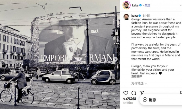 9月5日讯 不久前,卡卡更新酬酢媒体,挂牵了昨日离世的乔治-阿玛尼。