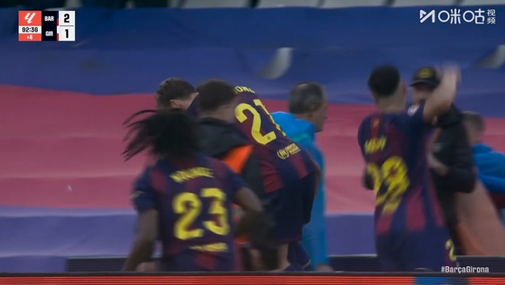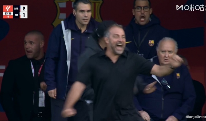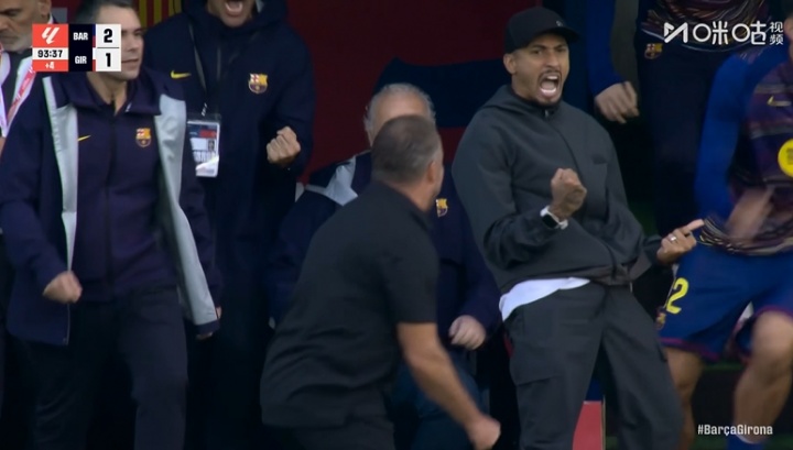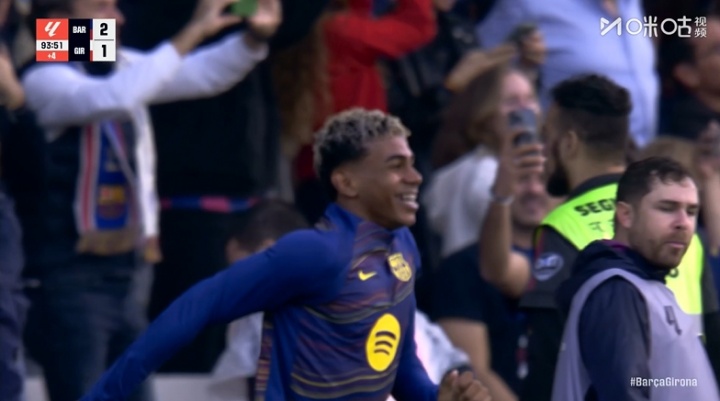 主帅弗里克、本场伤缺的拉菲尼亚在场边挥拳咆哮庆祝,此前替补下场的亚马尔也大笑着加入了庆祝的东说念主群。