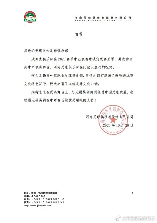 欣闻无锡吴钩俱乐部在2025赛季中乙联赛中锁定联赛亚军,并得手回到中甲联赛舞台,河南足球俱乐部在此致以由衷的道贺。