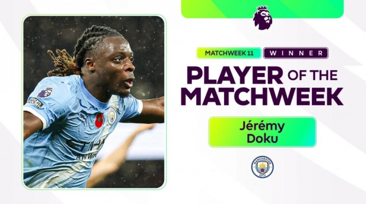 11月11日讯 英超官方音尘,经投票曼城边锋多库当选本轮最好球员。