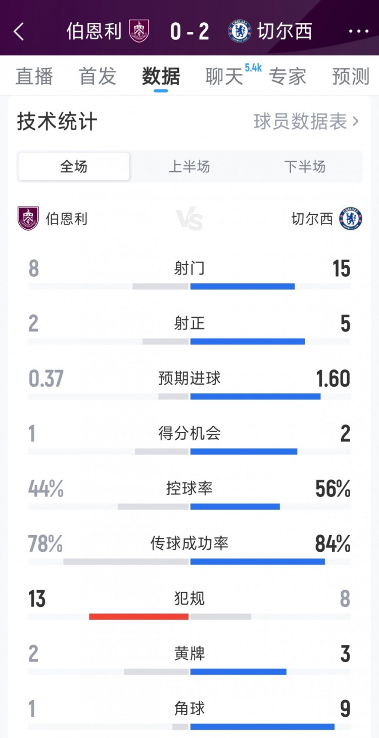 11月22日讯 在本轮英超,切尔西2-0打败伯恩利,以下为两边全场数据对比: