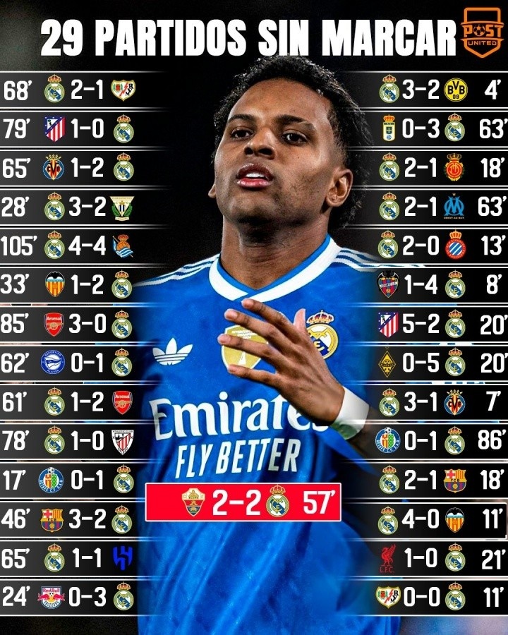 对阵赫罗纳的比赛竣事后,罗德里戈的球荒不息到了30场,这让他被刻在了皇骑兵史的“轻侮柱”上。