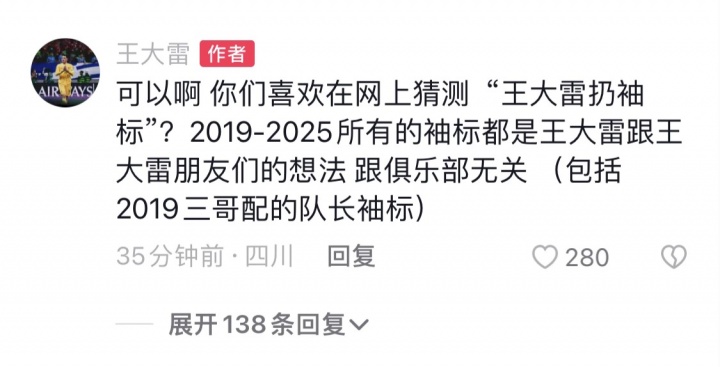 王大雷本日在个东谈主抖音计划区恢复外界品评:不错啊 你们心爱在网上推断 “王大雷扔袖标”?2019-2025通盘的袖标齐是王大雷跟王大雷一又友们的念念法 跟俱乐部无关 (包括2019三哥配的队长袖标)
