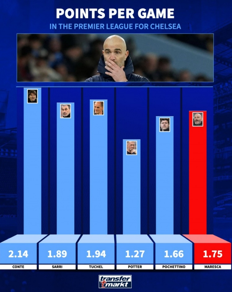 9月30日讯 切尔西近期战绩欠安,主帅马雷斯卡也受到不少质疑。德转盘货了切尔西近6位主帅在英超场均积分,其中马雷斯卡1.75分位居第四,具体如下: