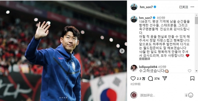 孙兴慜在酬酢媒体上写说念:“138场比赛,至心感谢与我共同创造记起时辰的球员、责任主说念主员,以及球迷们,感谢你们让我达成儿时的梦思,我感到至极炫耀和幸福。 ”