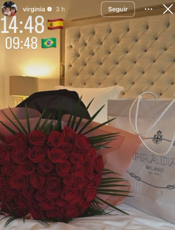 维尼修斯还配文谈:“V❤️V”,意为我方的名字(Vini)和女友的名字(Virginia)。
