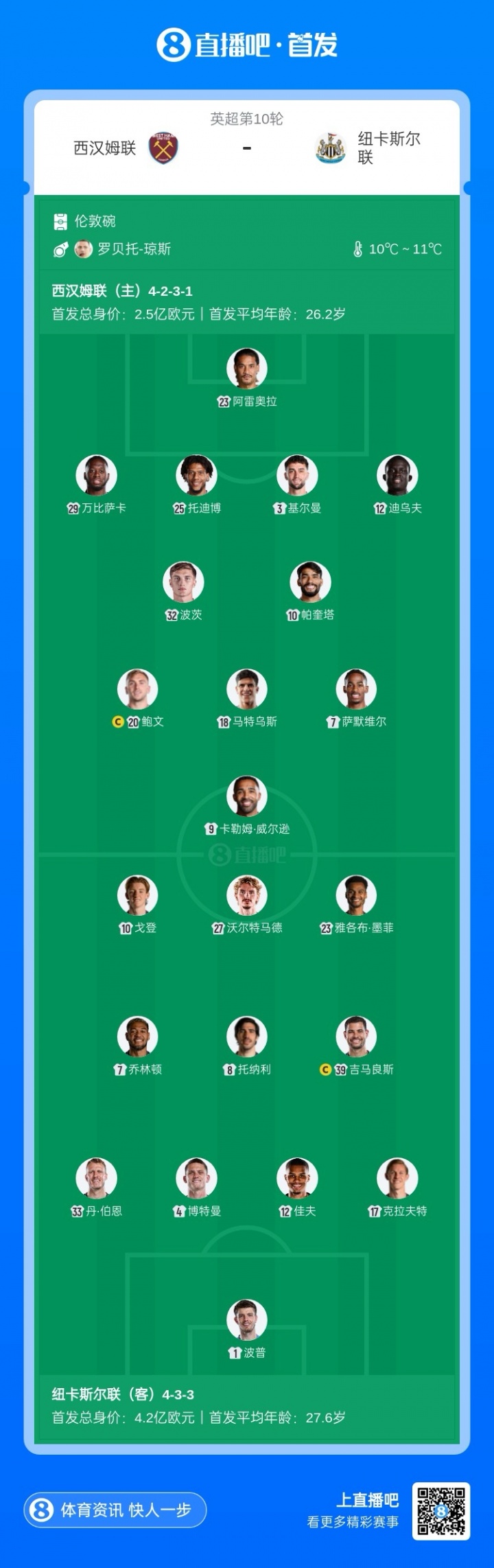 11月02日讯 北京工夫22:00,英超第10轮,西汉姆联vs纽卡,赛前两边首发公布!【本场比赛西汉姆联方面,威尔逊出任单箭头,波茨、帕奎塔搭档中场,纽卡方面沃尔特马德出任中锋,吉马良斯,托纳利镇守中场】