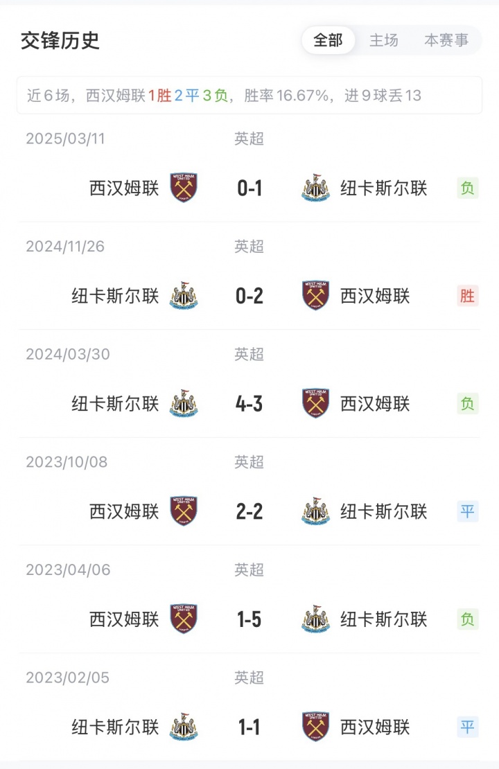 当今英超积分榜上,西汉姆联1胜1平7负,位列第19;纽卡斯尔联3胜3平3负,位列第13