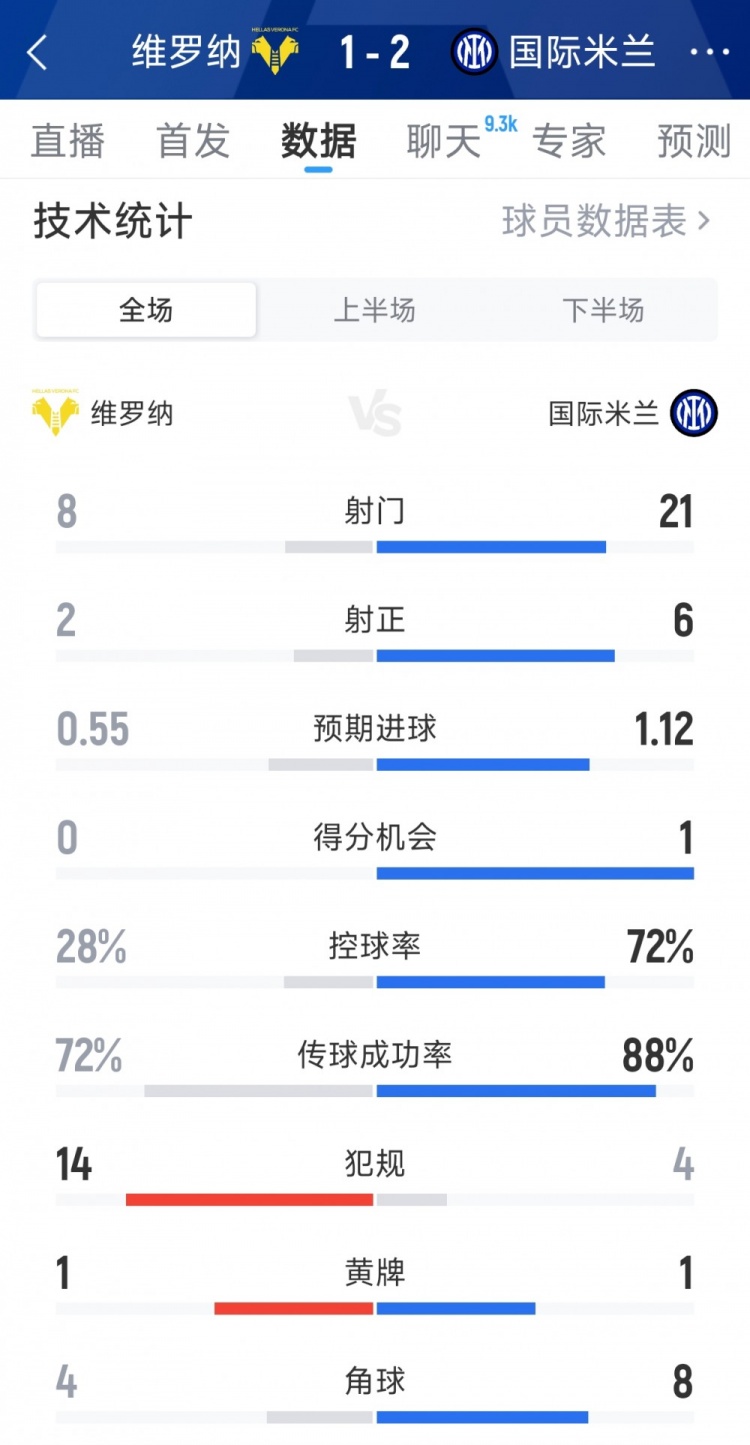 11月2日讯 在本轮意甲,国米2-1险胜维罗纳,以下为两边全场数据对比: