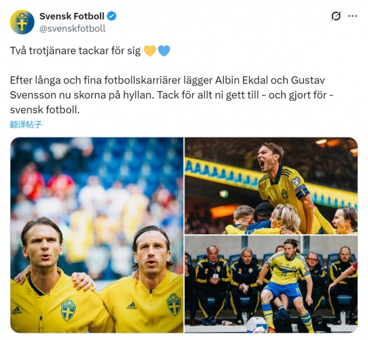 瑞典足协社媒写谈:“在渡过漫长而精彩的足球生活后,阿尔宾-埃克达尔与古斯塔夫-文明森认真挂靴退役。感谢你们为瑞典足球奉献的一切。”