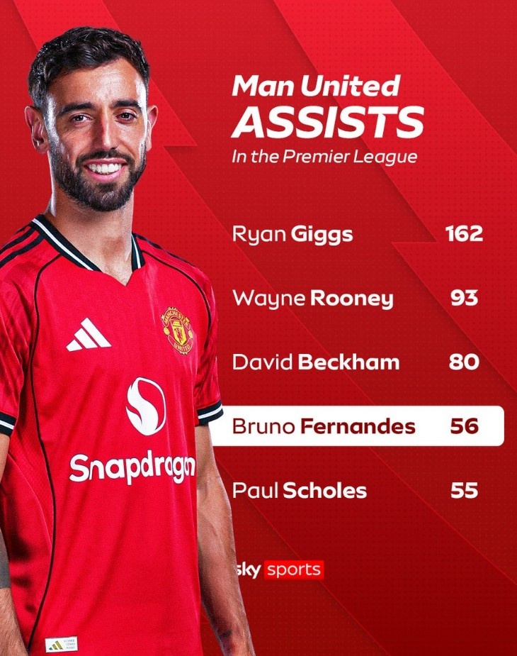 B费曼联生存英超助攻数仍是达到56次,超过名宿斯科尔斯,以下为曼联队史英超助攻榜:
