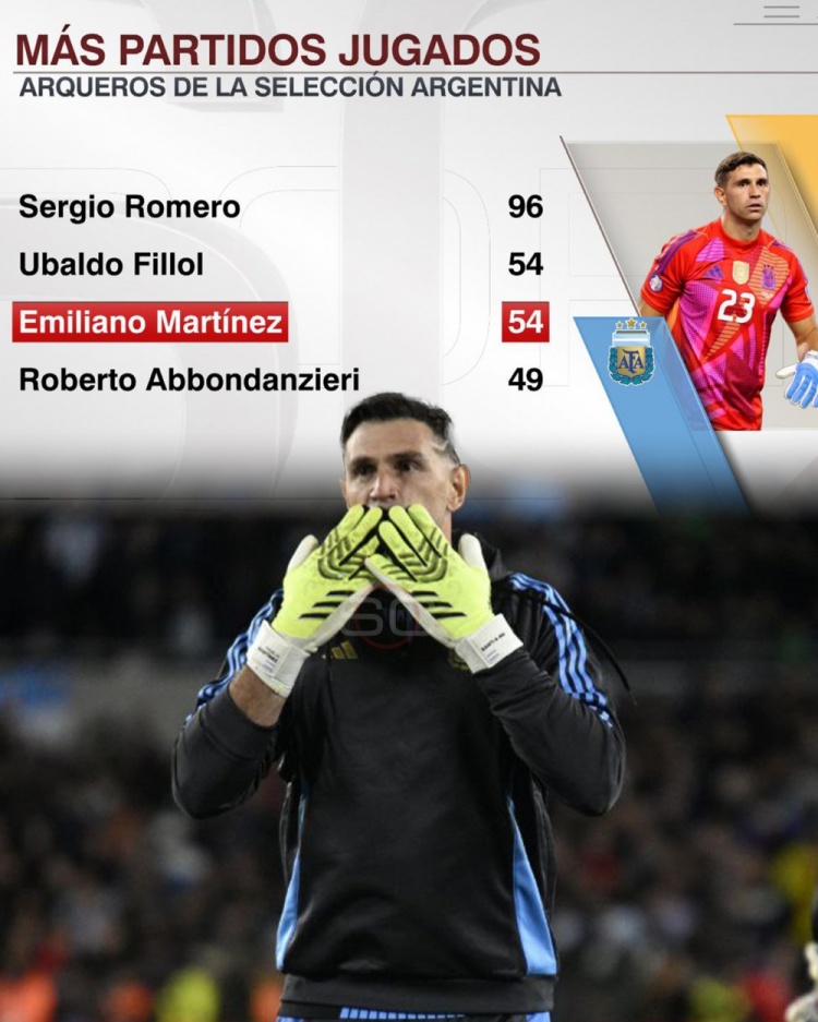 据ESPN统计,大马丁已为阿根廷出战54场比赛,追平菲洛尔并列队史门将出场第二多,而罗梅罗出场96次队史门将最多。