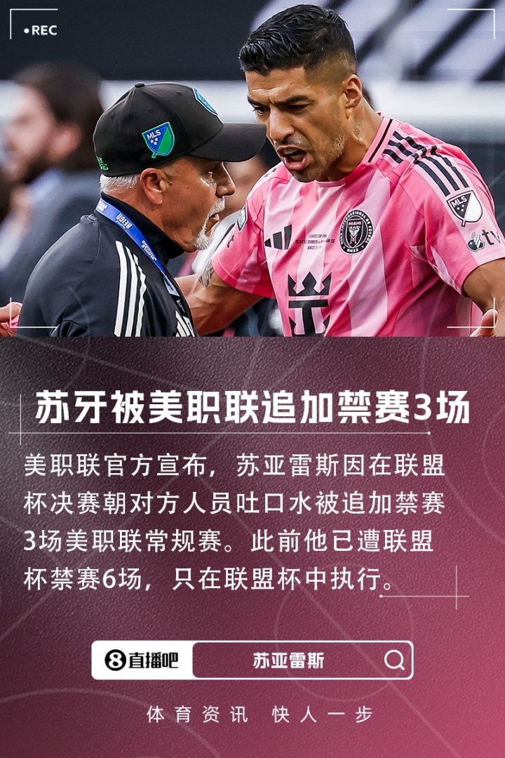 09月09日讯 好意思职联官方音讯,苏亚雷斯因在定约杯决赛朝对方东谈主员吐涎水被停赛3场好意思职联成例赛,布斯克茨未追加停赛。