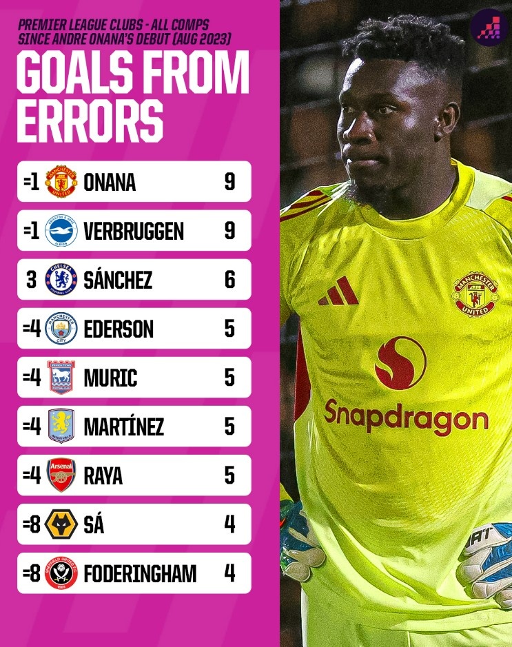 9月9日讯 曼联门将奥纳纳离队在即,OPTA也清点了自奥纳纳2023年8月加盟曼联以来,英超通盘门将在各项赛事出现颠倒导致失球数,奥纳纳比肩最多。具体如下: