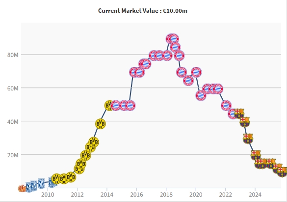 莱万的身价曾在2018年效用拜仁时期达到巅峰的9000万欧。