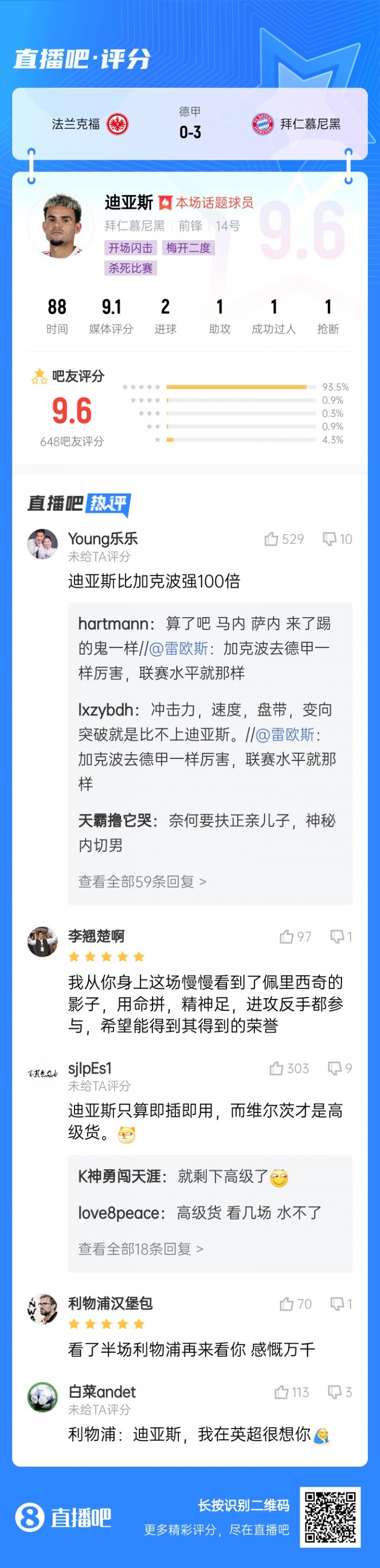第六轮评比成果结出炉,迪亚斯2射1传,匡助拜仁3-0完胜法兰克福,获取吧友超5万票救援,当选【X小红书德甲第6轮最好球员】!