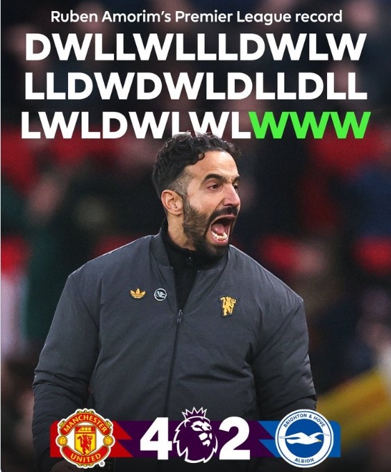 阿莫林握教曼联的前33场英超比赛从未获得过连胜,如今红魔获得3连胜,展示出了风雅无比的复苏势头。