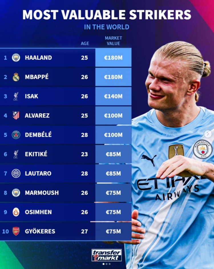 11月3日讯 德转列刻下天下足坛中锋身价名次,哈兰德、姆巴佩1.8亿欧比肩最高,伊萨克1.4亿欧,阿尔瓦雷斯、登贝莱1亿欧。