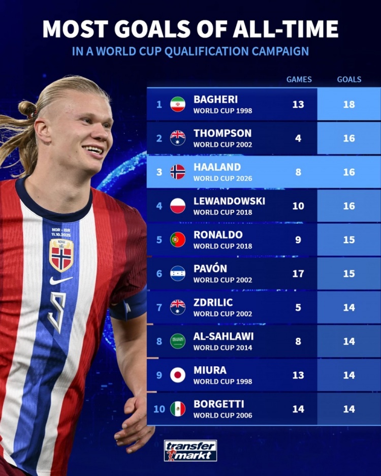 2026年全国杯预选赛——哈兰德(挪威)——8场16球