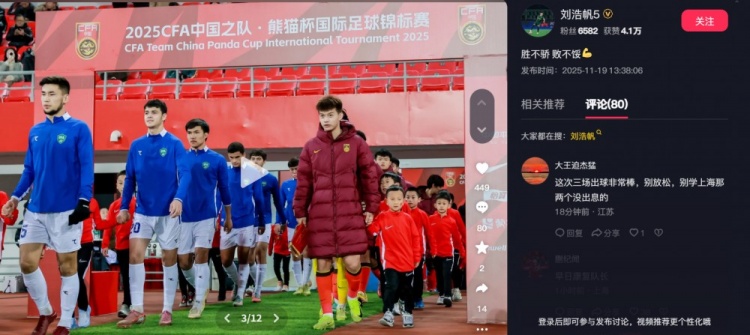 2025年熊猫杯落下帷幕,U22国足1胜1平1负得到亚军,当作球队队长,刘浩帆三场比赛沿途首发且打满270分钟。今天,刘浩帆发文记忆熊猫杯,他写谈:胜不骄 败不馁。