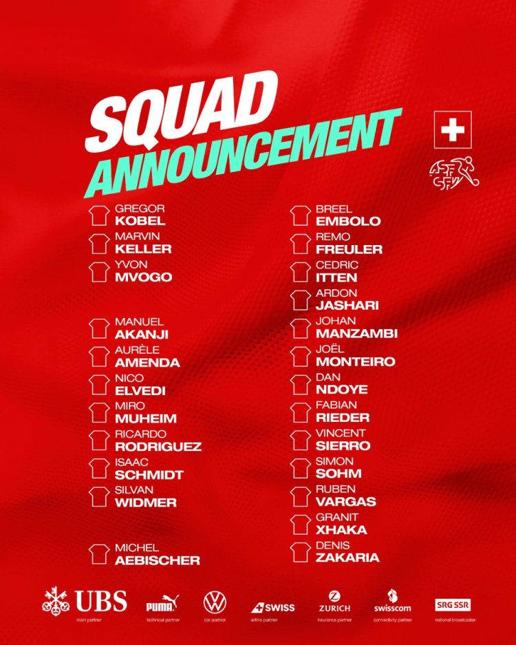 8月28日讯 瑞士公布出战下个月世初赛的球员名单,扎卡领衔,科贝尔、亚沙里、阿坎吉、恩多耶在列,首战将鄙人月5日对阵科索沃。