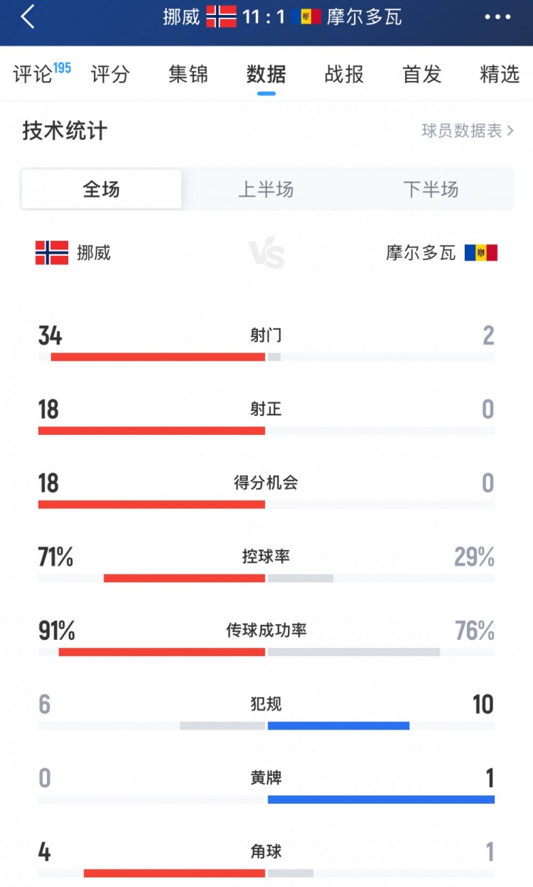 数据方面,主场作战的挪威队多项数据碾压摩尔多瓦,具体如下(主队挪威在前):