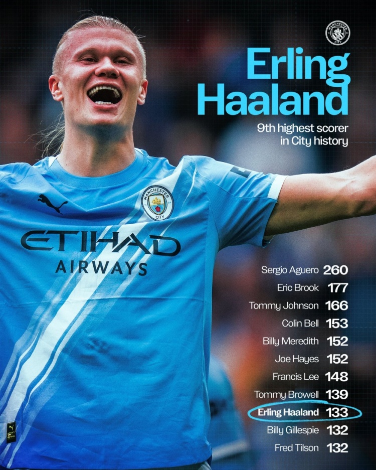 哈兰德为曼城打进133球,名次队史弓手榜第9位,曼城官方社媒晒出队史弓手榜,配文:“他势弗成挡。”