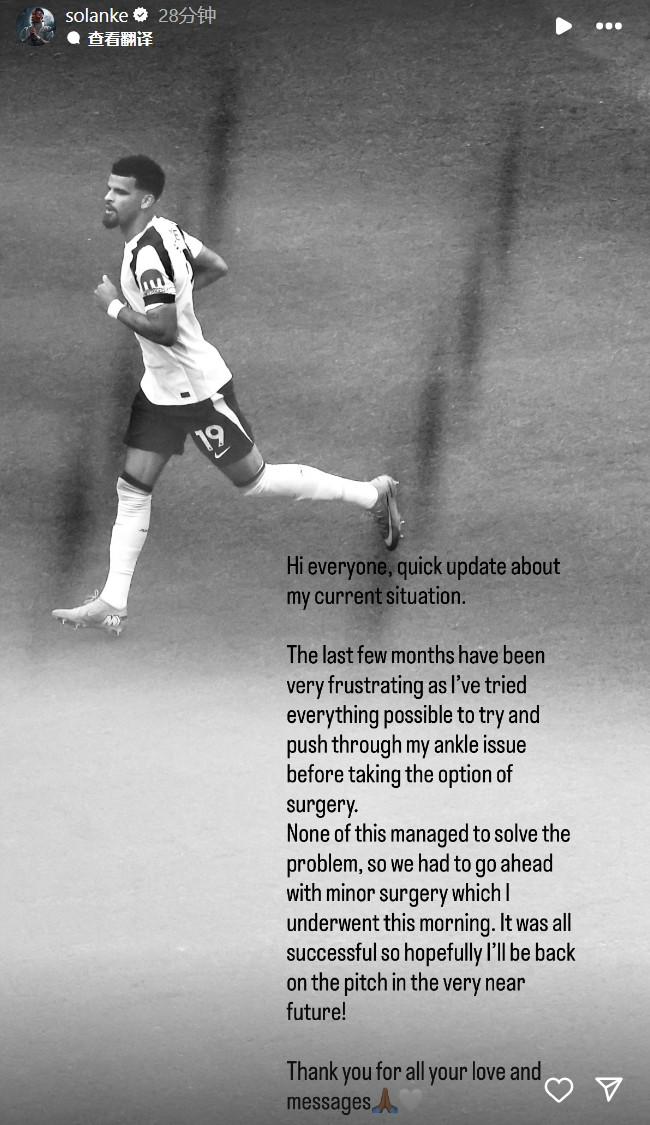 索兰克:“各人好,给各人快速更新一下我当今的情况。曩昔的几个月止境令东谈主憎恨,因为我尝试了所有可能的目的来惩办我的脚踝问题,但皆莫得告捷,是以今天早上我不得不罗致了小手术。手术很告捷,但愿很快就能回到球场上!感谢各人的关怀和支援。”