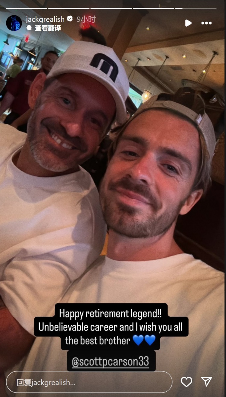格拉利什社媒晒出与卡森的合照,配文:“退役自得,传说!”