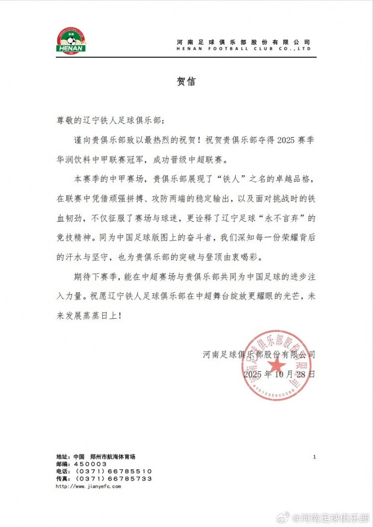 谨向辽宁铁东说念主俱乐部致以最激烈的祈福!祈福贵俱乐部夺得2025赛季中甲联赛冠军,得胜晋级中超联赛。