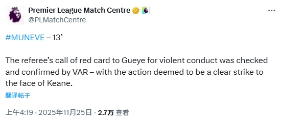 英超官方给出施展:“主裁判认定盖耶推行暴力活动并出示红牌的判罚,经VAR时代核查证实,该看成被判定为对基恩面部的显着击打看成。”