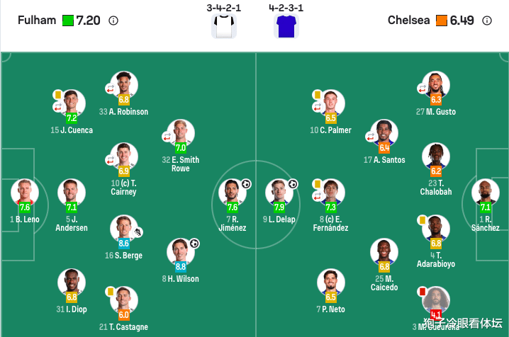 富勒姆首发:1-莱诺、31-迪奥普、5-约阿希姆·安诺森、15-昆卡(46’22-凯文)、21-卡斯塔涅、16-博格、10-凯尔尼(73’20-卢基奇)、33-罗宾逊(73’30-塞塞尼翁)、8-哈里-威尔逊(91’11-特劳雷)、32-史小姐·罗(83’6-里德)、7-希门尼斯。