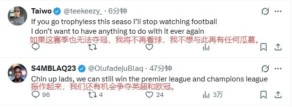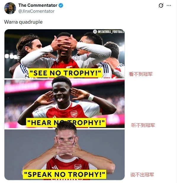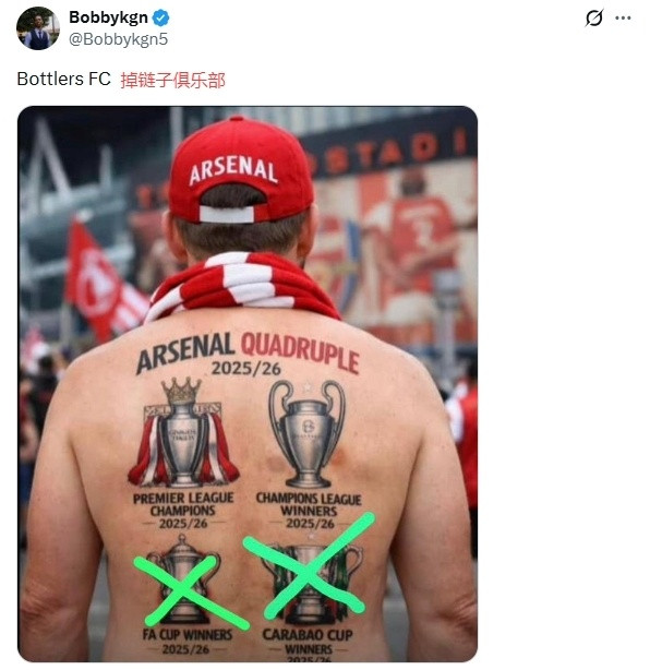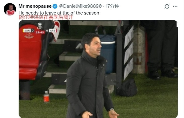 此外,部分阿森纳球迷也再次质疑主帅阿尔特塔:“本赛季坐拥如此豪华的阵形 ,却连丢2冠,你究竟要什么时候才会承担责任!”:“阿尔特塔请在赛季结束后离开!”:“阿尔特塔的气质,注定了他的球队,永远都与奖杯遥不可及!”