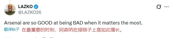 阿森纳球迷失望写道:“掉链子俱乐部(bottlers FC)!”:“每个赛季在最重要的时刻,阿森纳在掉链子方面是如此擅长!”