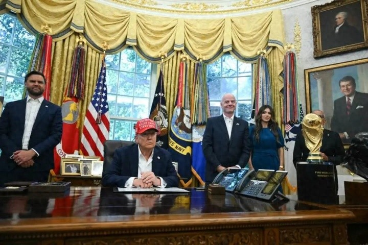副总统JD-万斯(左一)、海外足联主席詹尼-因凡蒂诺(右二)及国土安一皆长克里斯蒂-诺姆(右一)共同见证这次公告。