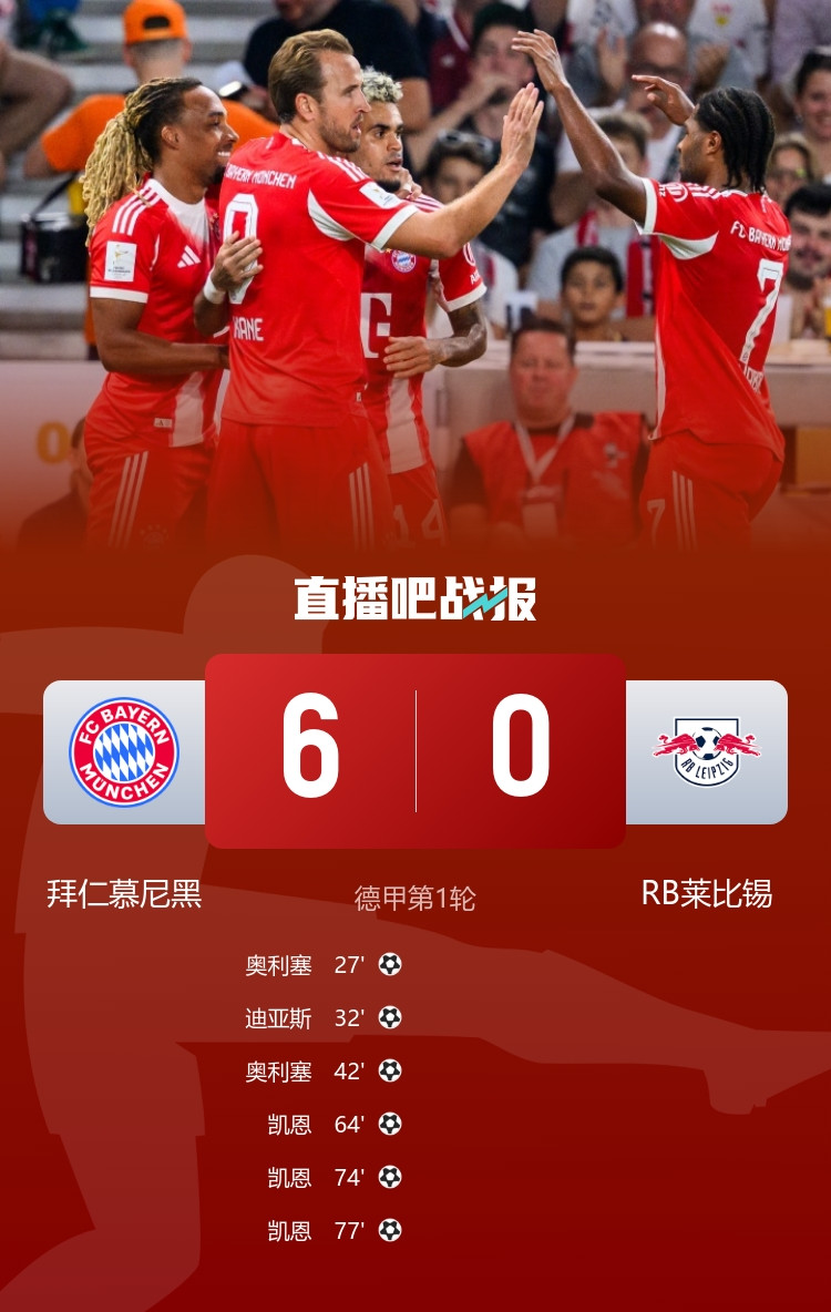 德甲首轮,拜仁6-0横扫莱比锡拿下开门红,凯恩首轮就戴帽,新援迪亚斯1球2助瓦解出色,奥利塞斩获两球。