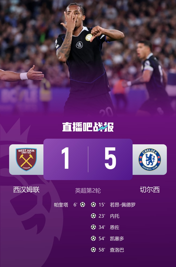 赛季首胜!切尔西5-1大捷西汉姆联佩德罗1射2传恩佐&凯塞多立功