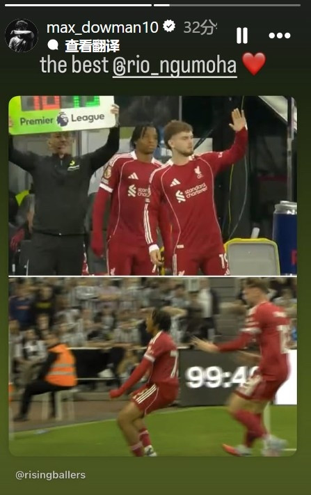 谈曼晒出了恩古莫哈代表利物浦替补登场,以及打进绝杀球的时期,配文写谈:最棒的恩古莫哈。