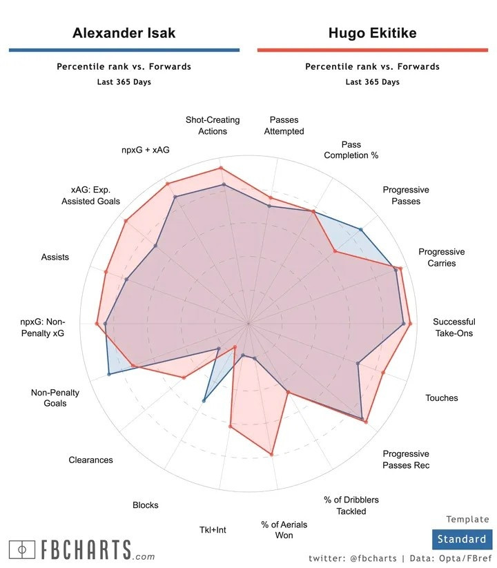 除了教授差距,这两位躯壳要求相似的先锋,在时期特质上也有显明辩认——这大致亦然利物浦在已引进埃基蒂克的情况下,仍决定签下伊萨克的要道原因。
