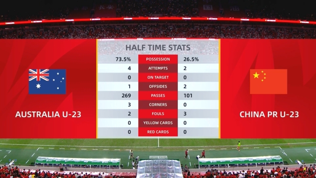 09月09日讯 U23亚洲杯预选赛D组第3轮,澳大利亚U23半场0-0中国U22,半场数据统计如图所示。